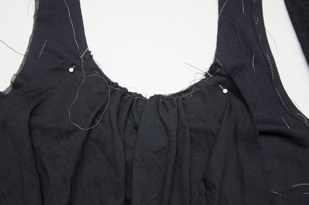 Since there are so many tiny details on the top and the materials I used were quite fiddly I did extensive basting before sewing the seams. Yes it add some times initially but I think for me it saves time in the end, because fewer mistakes are made. This is actually a top that can be made without a serger and a coverlock since the modal jersey is quite stable and there is no hemming involved thanks to the folded waistband. All you really need is a machine that has a stretch stitch. I used a serger for the side seams though.