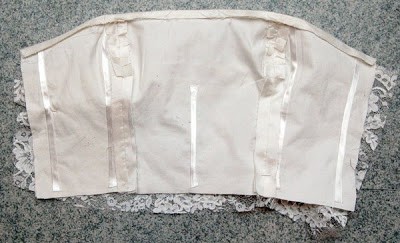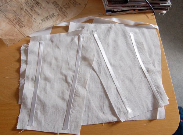The boning casings. I used a narrow satin bias binding for the casings. I picked binding because I find it easier to apply than flat ribbons. The underling is an old bed sheet.