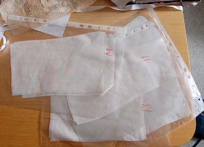 Very orderly. This is totally uncharacteristic for me, but in order to keep tab of all the lining pieces and keep them from fraying I placed them in embossed pockets with matching pattern numbers. There will be two layers of lining, one outer under the lace and one on the inside hiding the underling and boning.