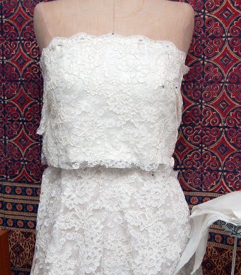 The front bodice. I am following the method in Susan Khaljes book which has you applying the lace in one piece and then shaping it on the bodice using darts and tacks.