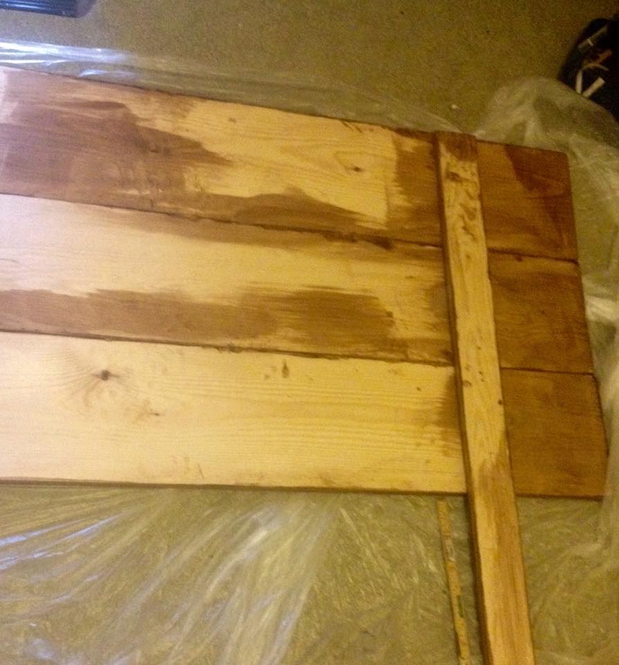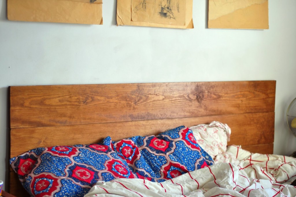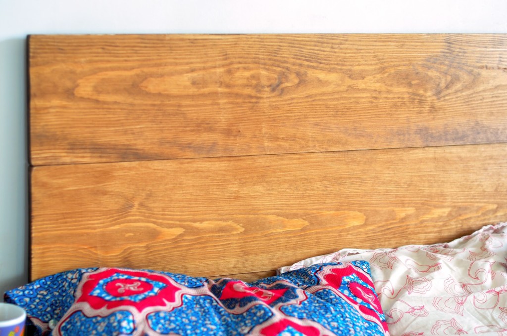 For the headboard I used plain pine wood planks that I glazed with an environment friendly teak stain.