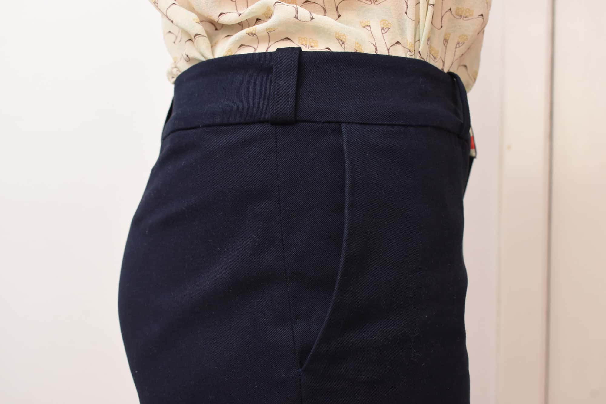 If you look closely you’ll see that the belt loops have not been stitched in place on the outside. I tried this technique for the first time with these trousers and loved it. I found the method in the Pants for real people book (Amazon affiliate link) and it is pretty genius! I really like the clean look of these belt loops. The waistband is kept in place using the stitch-in-the-ditch technique and while I didn’t achieve a 100% accurate finishing on the inside, it was the best application so far.