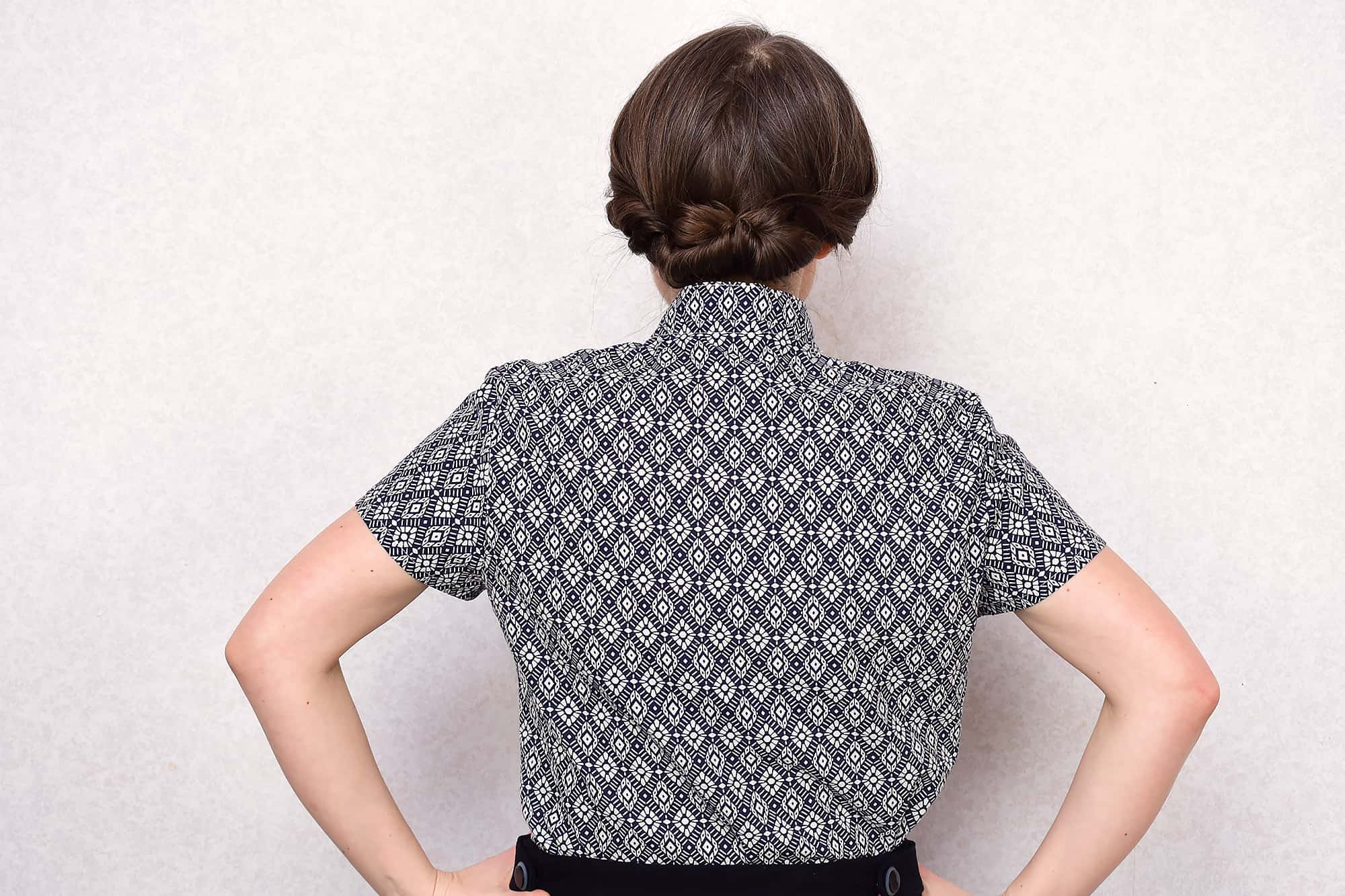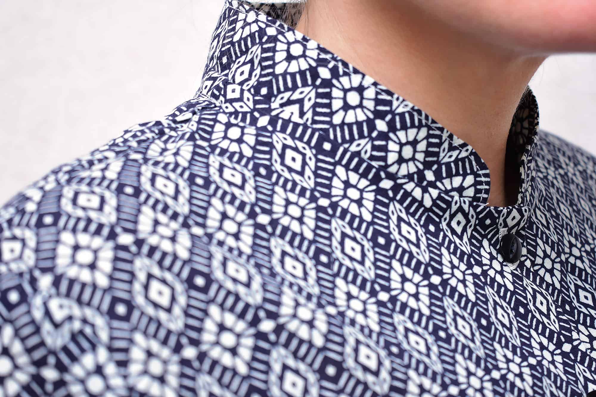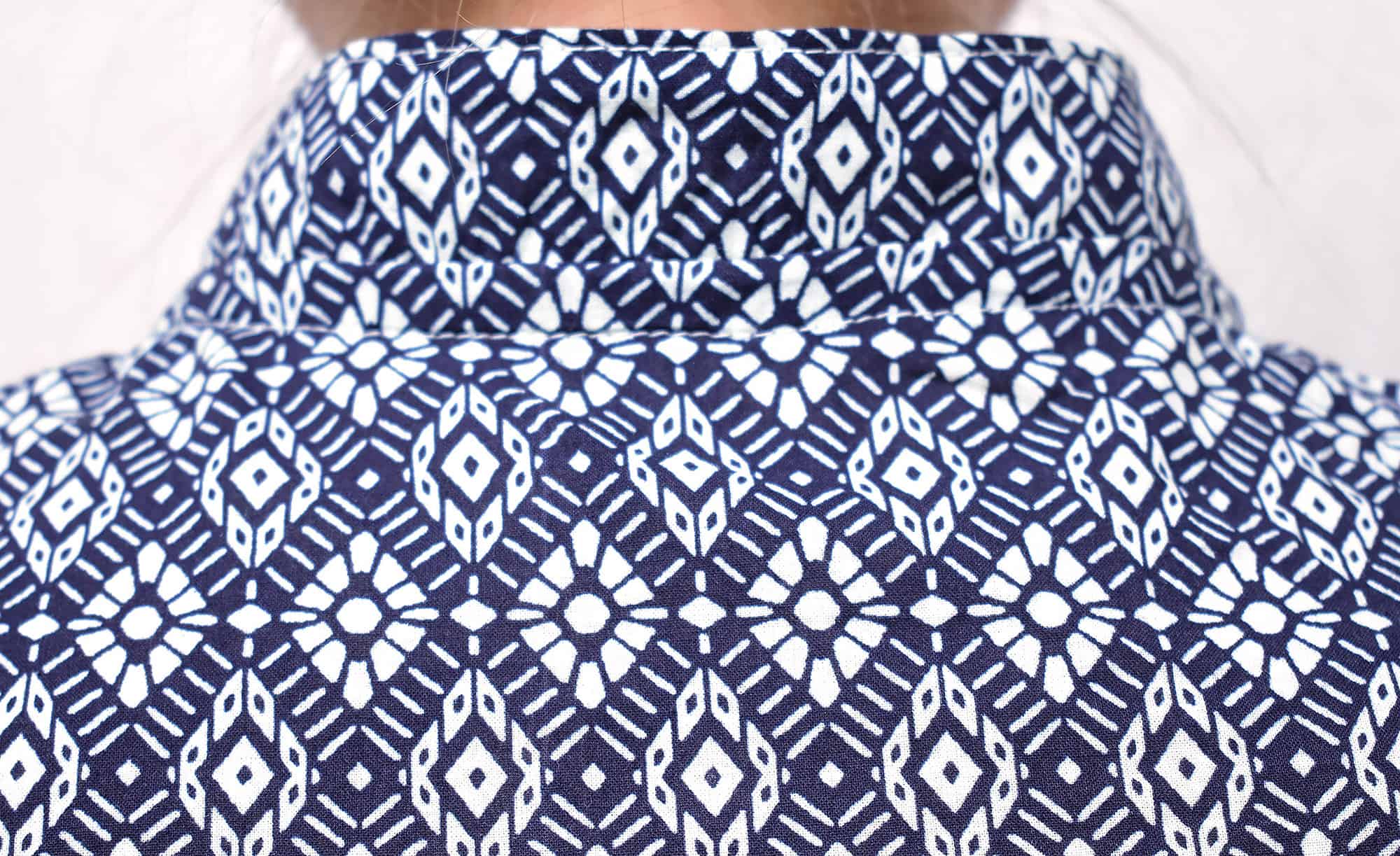 As you can see the collar is a very simple, just hidden behind the placket facing  in the front, and in the back the seam is covered with a bias strip (the stitching in the back). Neat and easy.