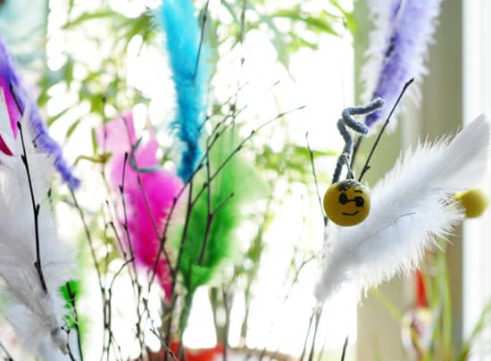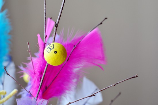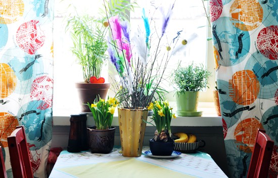 We don’t have a ton of Easter traditions, but a few things are important to me. First I love having Easter egg hunts, although this year I made a total fool of myself since I was completely inept in finding my candy filled egg, despite being given numerous clues. So when everyone else was munching on sweets I was still running around the apartment trying to find my egg. Secondly I always use a yellow and turquoise vintage table cloth when we eat  our dinner, which is the only time we have a table cloth, except possibly for Christmas. And thirdly we usually have some traditional Easter twigs decorated with feathers. The kids always makes the best decorations, it was great when they were in kindergarten and always came home with some fun seasonal craft. Not so much anymore, but I love the little yellow faces that my daughter did for the twigs.