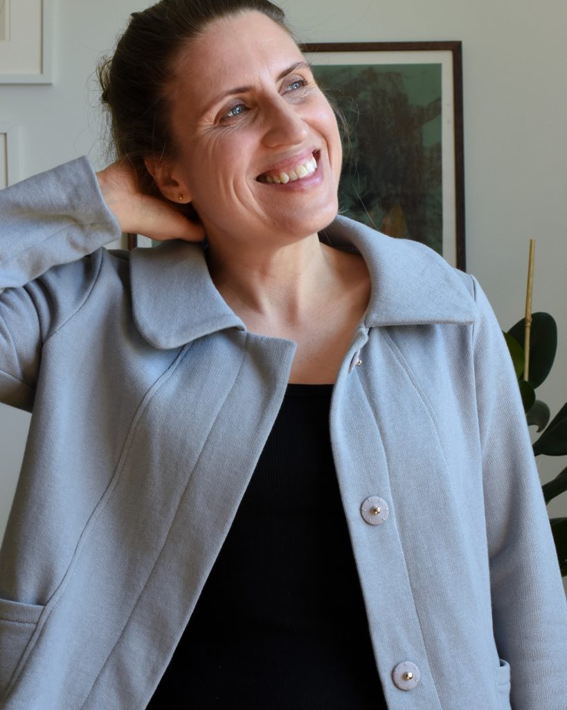 Here is a recent version of my Eivy Cardigan Pattern that I made from a really nice sweatshirt fabric. I’m really happy with how it turned out; the cardigan strikes a nice balance between comfort and slightly dressy. A perfect look for fall I think!