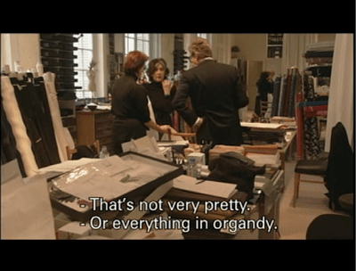 Yves Saint Laurent 5 avenue Marceau 75116 Paris: Same director but this movie shows the development of a couture collection. It must have been the longest 1,5 hour I’ve spent in front of a screen lately. Everything goes soo slow. The movie is centered around the evaluation process and is set in the show room where the fit models stride with their dresses in various stages of finishing.