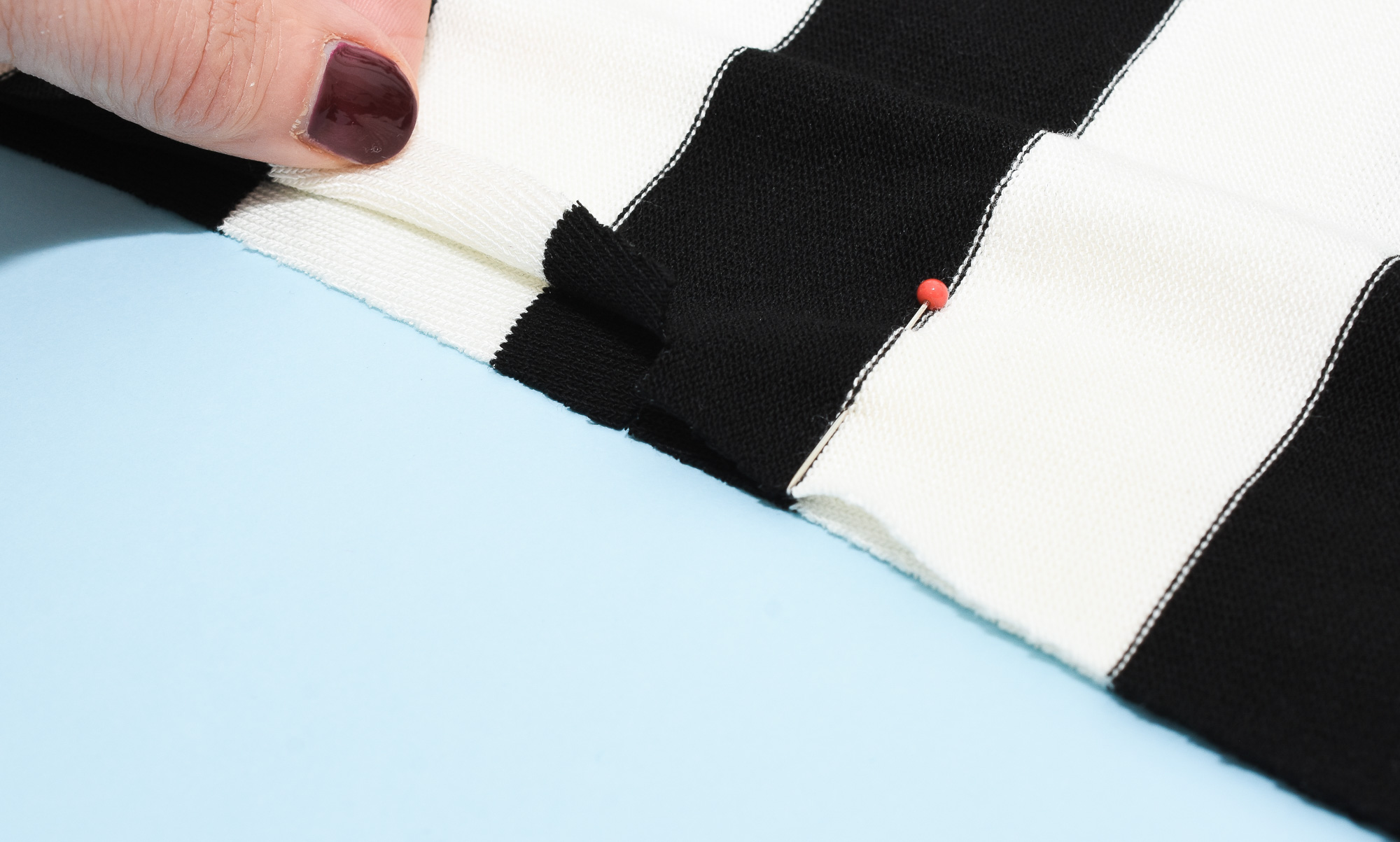 The sleeve cap on the Gurli Top is slightly shorter than the armhole (i.e. negative ease) for optimal fit and should be stretched out gently during the sewing. The important thing is to match the notches.