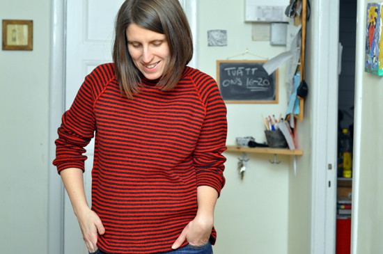 Made this wool pullover super quick yesterday. I need a new wool sweater since my old hand me down pretty much fell apart earlier this winter. But this one won’t make the cut as a new wardrobe staple, mostly due to the fabric. I ordered the wool rib knit from Denver fabrics (Fashion fabric club) and it was a mess to work with. It has zero stability, stretches like crazy the minute you touch it. You can see some of the waviness in the hem in the first photo. Sometimes I wonder why they bother making these kinds of fabrics, as they are pretty much useless, both to wear and to sew. Maybe this was a failed factory sample that Denver got hold off? I’ve ordered a few things from them lately and I have to say it has been mostly duds and the descriptions are so sparse and not entirely accurate either which makes purchasing a gamble. I much prefer shopping from vendors like Emma one sock and Gorgeous fabrics, the quality is higher and they really take the time when working on descriptions, which is invaluable when you can’t touch the fabrics.
