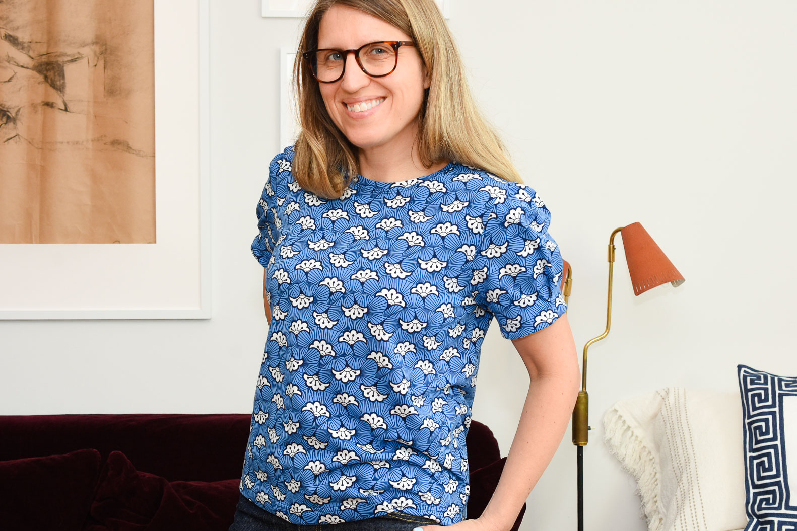 The front looks just like a regular t-shirt, since I like the idea of making the back the full focus. The fabric was definitely tricky to work with though, very soft and stretchy, and for the first time, I got some coverstitch tunnelling on my Janome Coverpro that I couldn’t fix by changing the settings. Though I’m happy to report that after having a mechanic servicing and cleaning the machine, it seems like the problem is solved, though I think it was also due to the fabric being tricky.