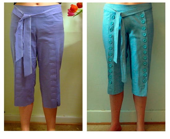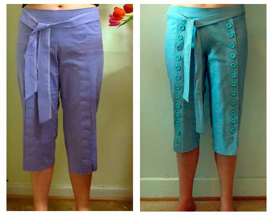The fabric I wanted to use for these pants was a lycra/linen mix, so I picked a cheap lycra/cotton shirting fabric for the muslin. By using a lycra fabric I was more able to assert the proper fit and ease, since a non stretch fabric would have been too tight.