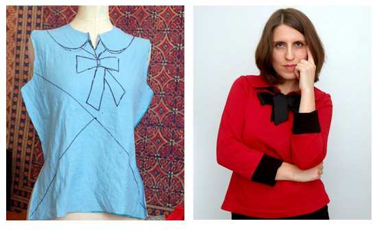 When making test garments for knits, I always use knit fabric of similar quality. For this project I just used some odd t-shirt fabric, that I also scribbled on to mark seam lines and details.