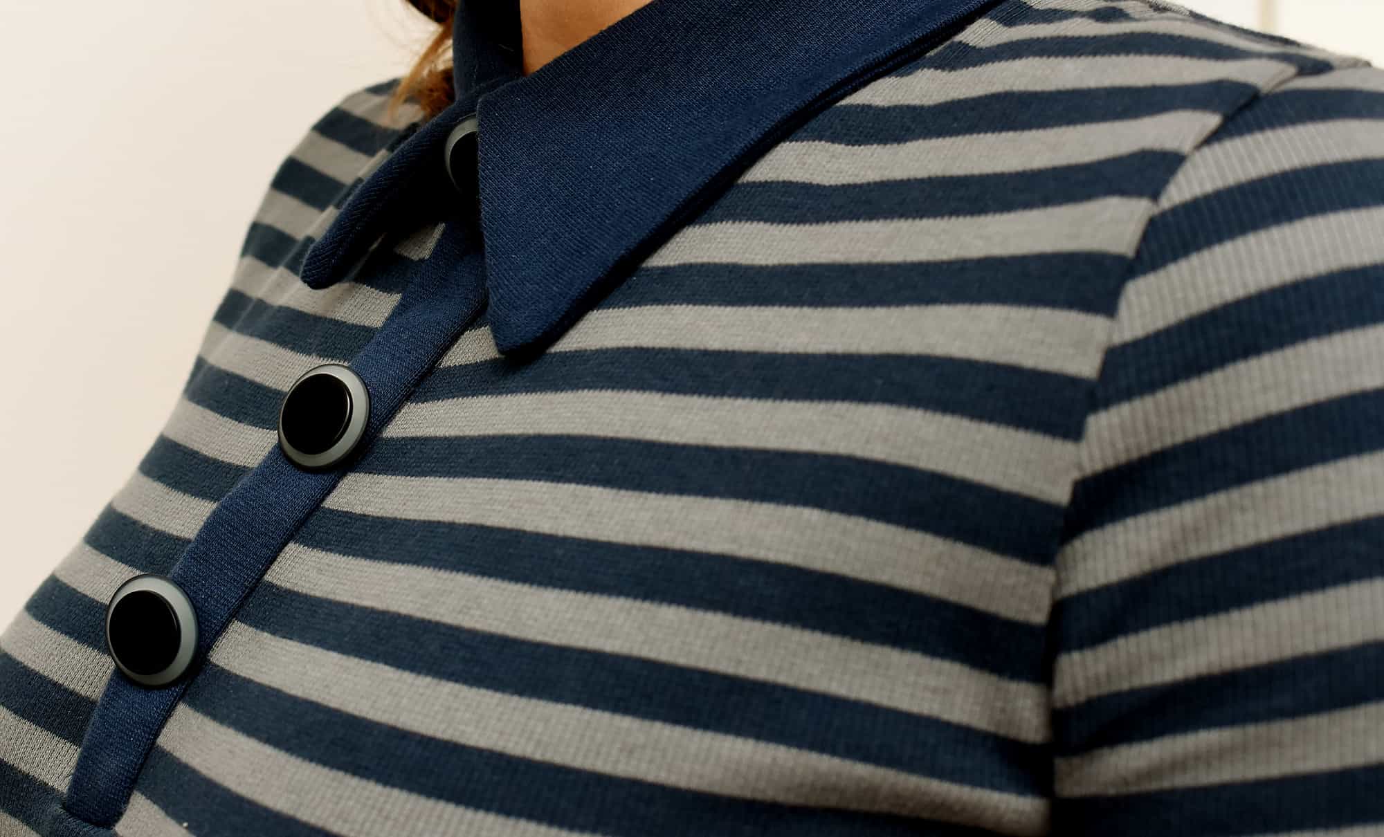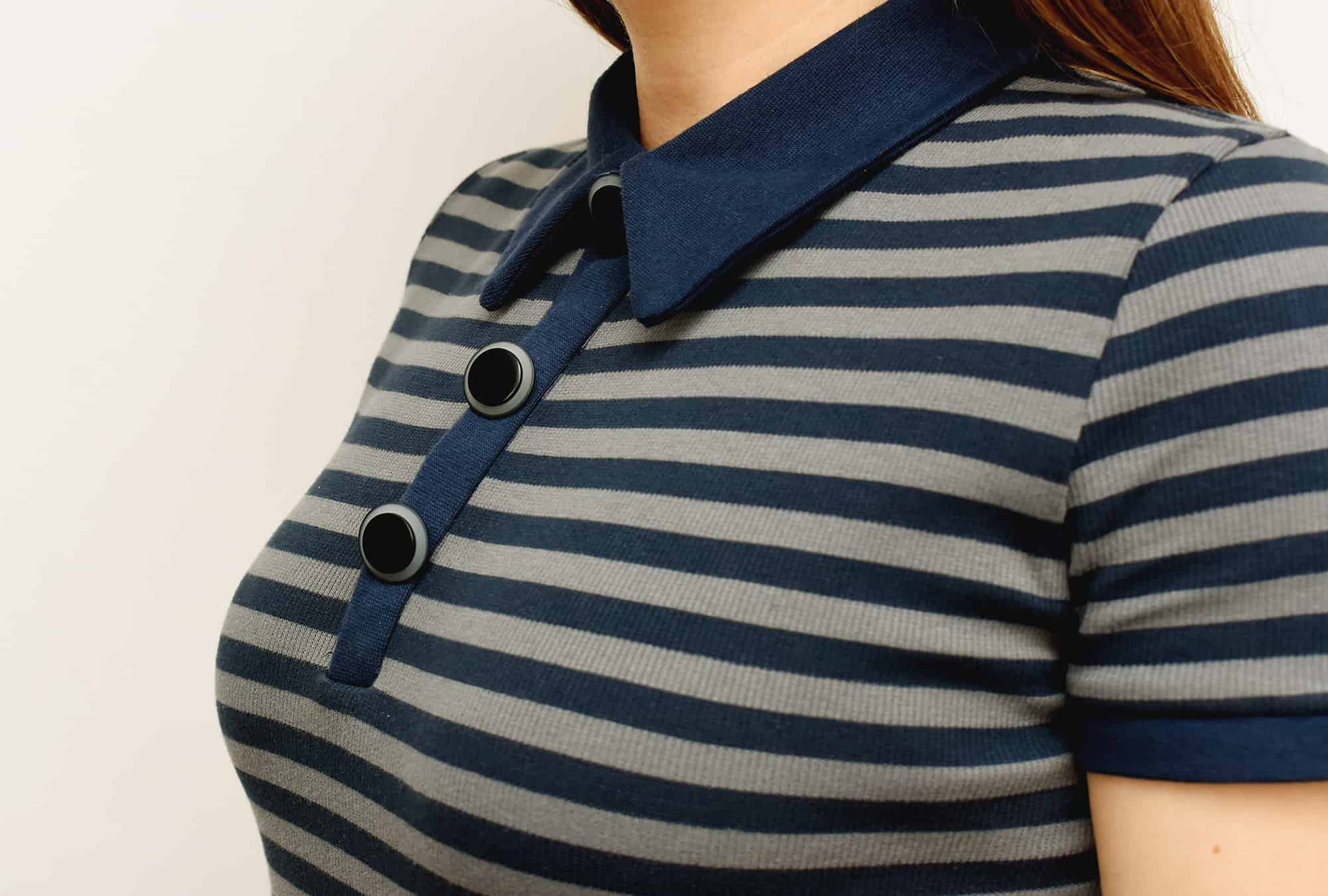 The cuffs, collar and placket are all made of a cotton/lycra rib knit. I visited A LOT of stores until I found a blue ribbing that matched okay. There are so many navy blue shades out there, which I didn’t think of until I began looking for a match.