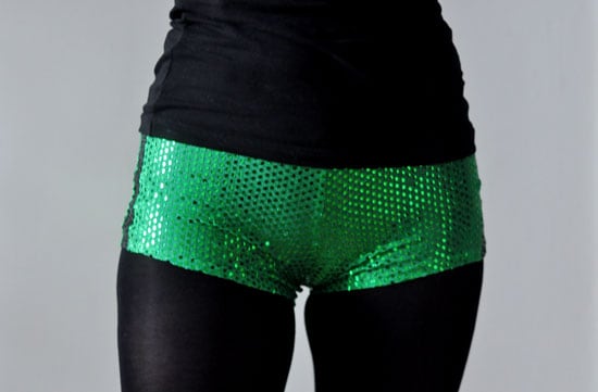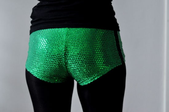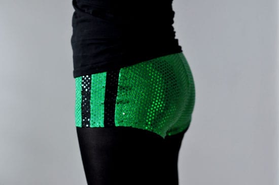 Today my friend and roller derby team mate Cattie has a bash to celebrate her 30th birthday. I joked one training that I should make her a pair of sequin hot pants in our team colours. And since I try to be a person of my word I decided to do just that. I have never sewn anything with sequins before and picked a fairly easy fabric, a knit with the small sequins placed fairly far apart, so I didn’t have to remove any sequins when sewing. Normally I think you have to rip off the sequins on the seam allowance since the needle can’t work through them, am I right?