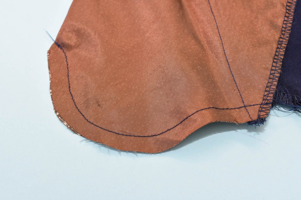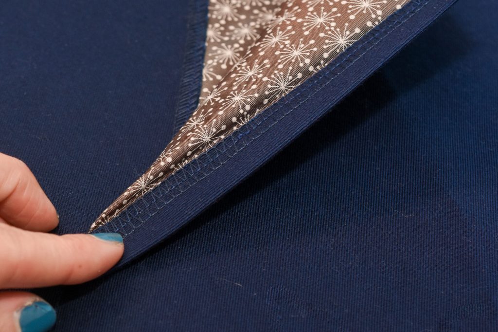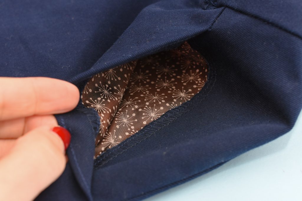 Understitch close to the folded edge to prevent this from happening. Understitching also prevents unravelling if you haven’t overcasted the pocket opening edge of the lining.