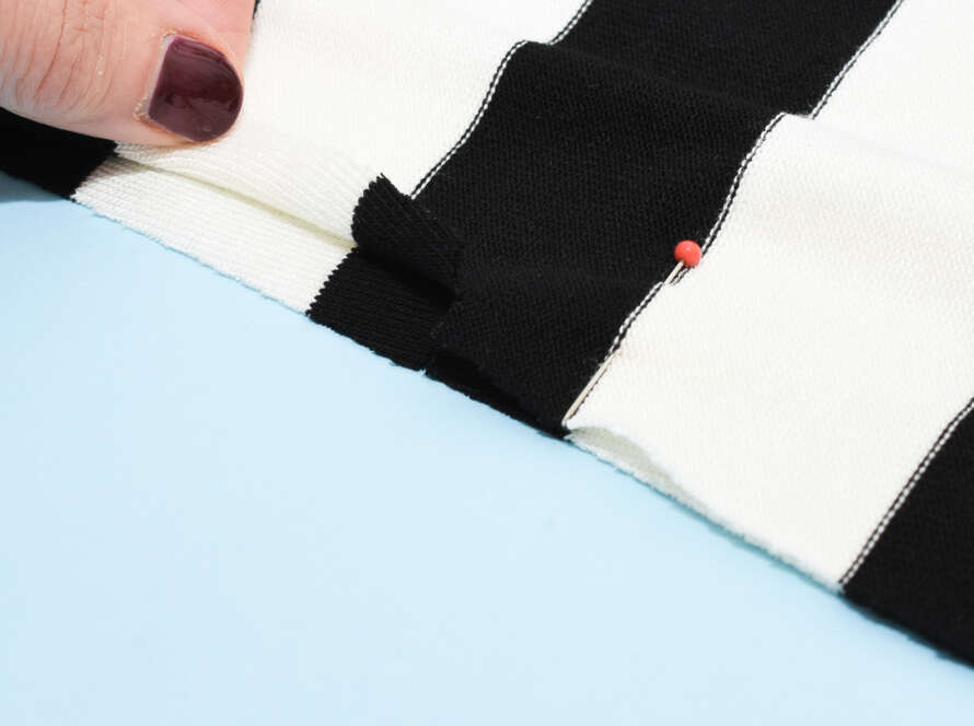 Place the strips on the wrong side of the top, along the fabric edge. The stabilising strips can be placed either on the front or back shoulders, depending on the material used to stabilise the fabric.