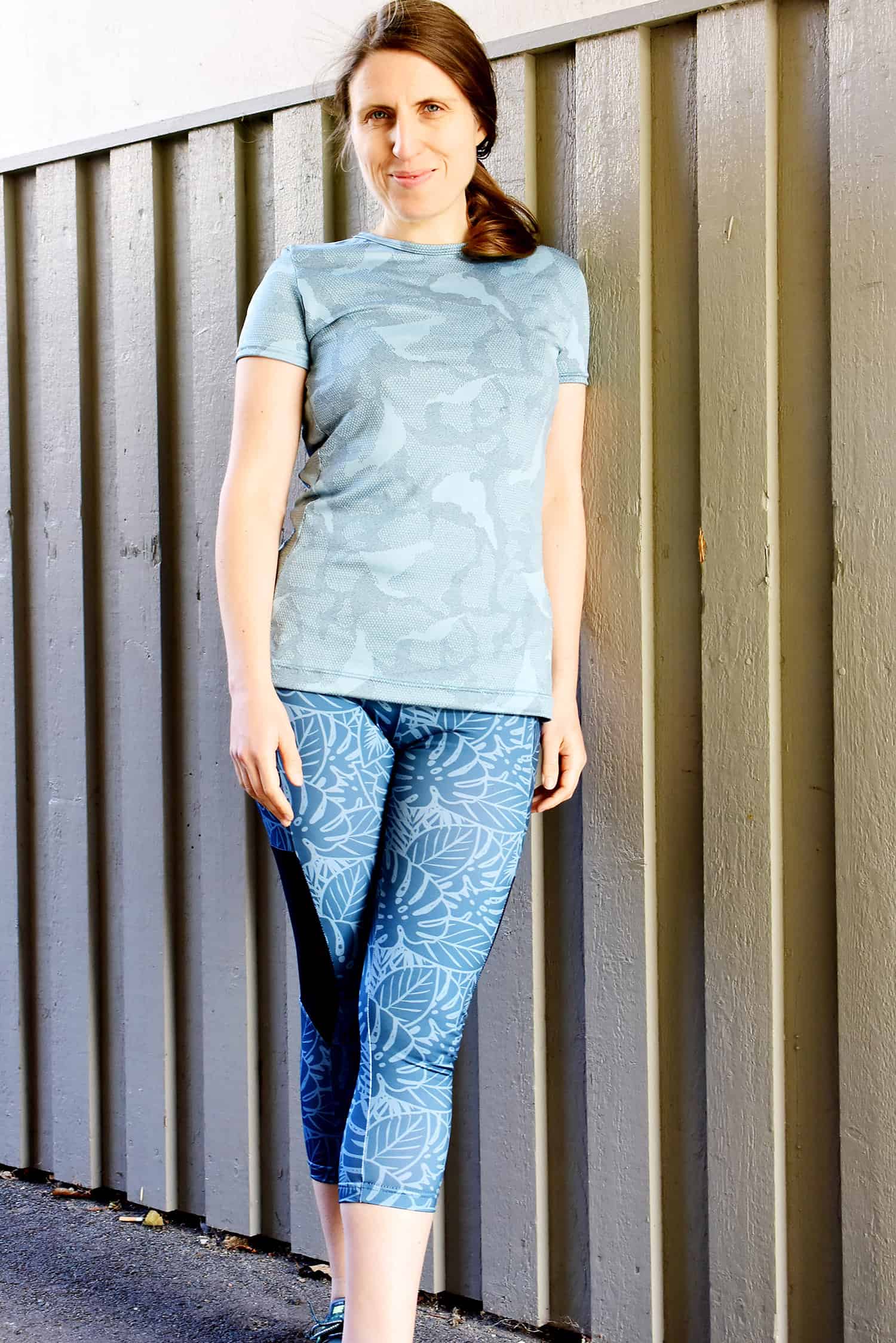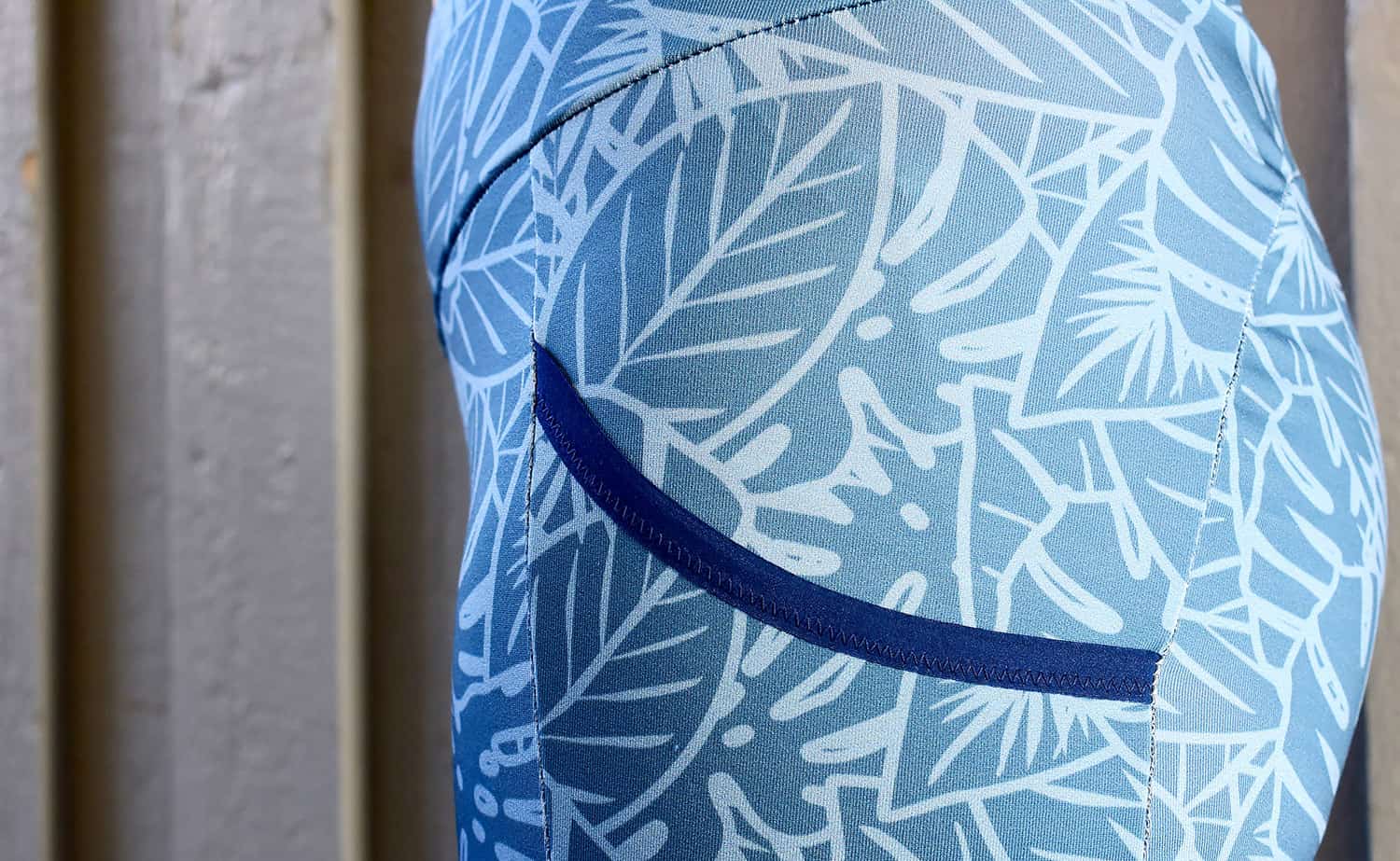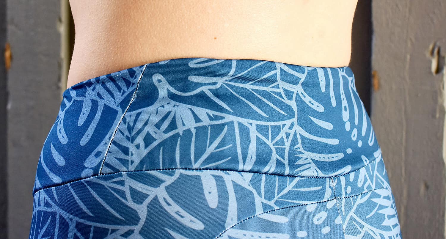 Spoonflower prints on a white fabric which is a factor to consider. There is a smidgen of the white showing at the seams and over the bum where the fabric is stretched out a lot. I was given a heads-up about this before I went and ordered the fabric, and to me it’s not an issue, but I think lighter prints might work better than really dark colours if the white sheen is something you want to avoid completely. I’ve also noticed that a lot of RTW activewear brands use this print on white technique now with the bold pattern trend, so this way of printing is fairly common.