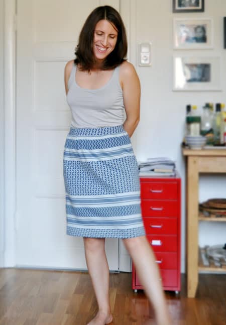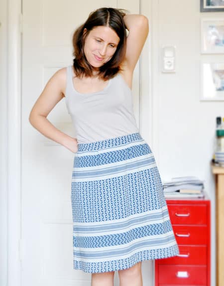 The title of this post is a little deceptive – this is not made of a actual table cloth. But the women who sold me the fabric told me that a customer said it looked just like a cloth you put on the kitchen table. I’m not sure the customer meant it in a good way, but for me the this is the USP of the fabric (aka unique selling point, sorry for the biz lingo, have been watching a lot of The Apprentice UK lately!). The pattern is like a cross between a kitchen towel, a table cloth and vintage mattress ticking. Another great thing about this fabric is that it is a soft cotton knit. so it falls really beautifully. I drafted the pattern myself, the method is similar to how I did this skirt (but with less gathers). Promised to make a tutorial on how to make this easy skirt pattern, but I lost some of the pics, so I need to take a few new ones before I can post it.