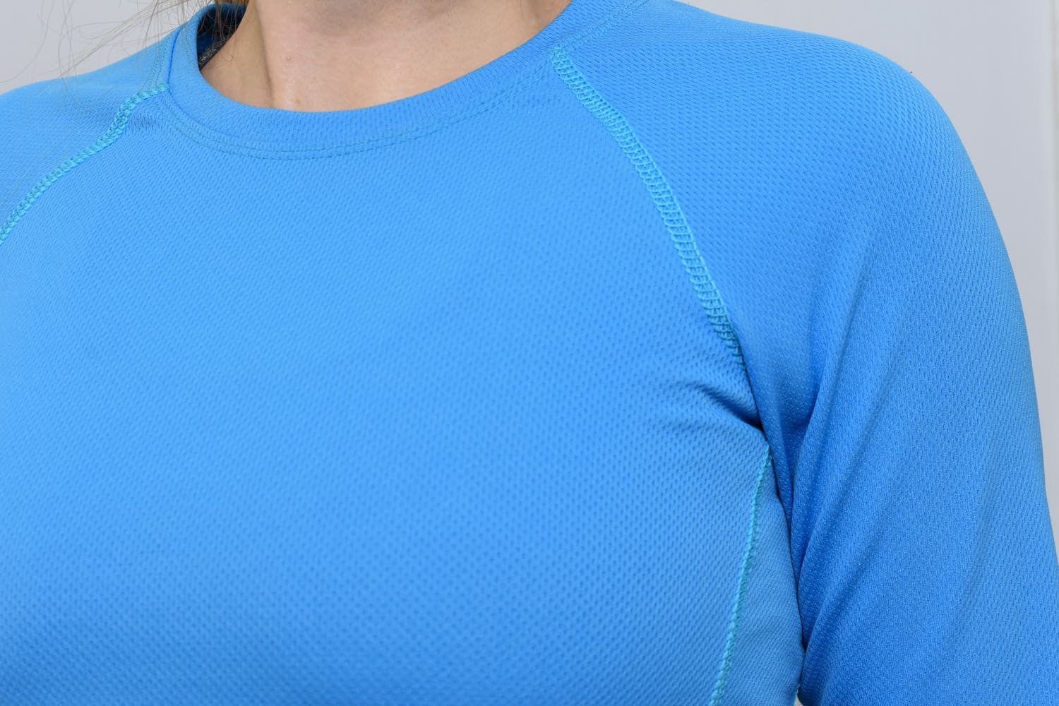 The fabric is a polyester base-layer wickaway fabric, with grids embossed the fabric to better transport the moisture.