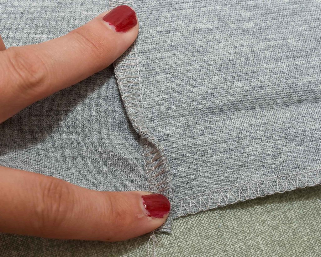 Overcast the edges. This step is optional, but if you have a serger I highly recommend that you overcast the knit fabric hem with a 3-thread wide overlock. To prevent the fabric from stretching out during hemming you can increase the differential feed slightly on the serger.