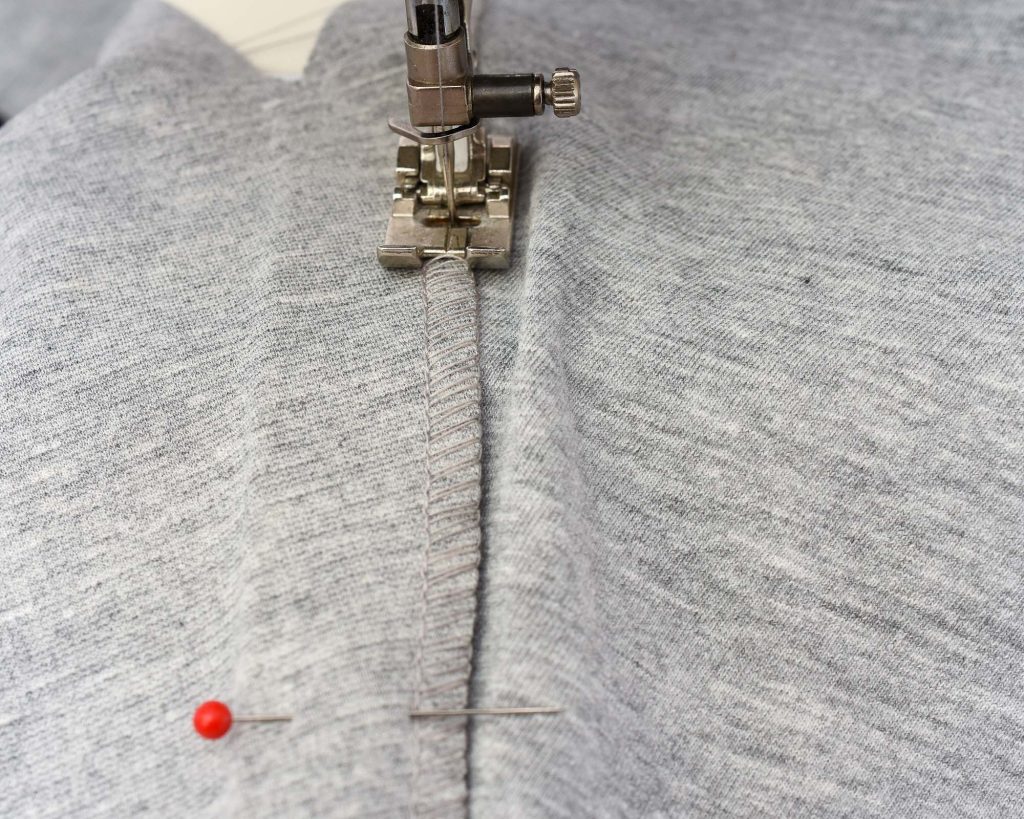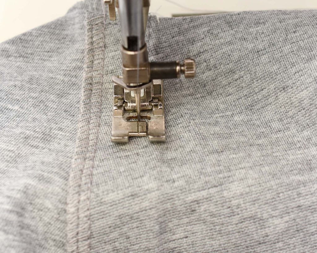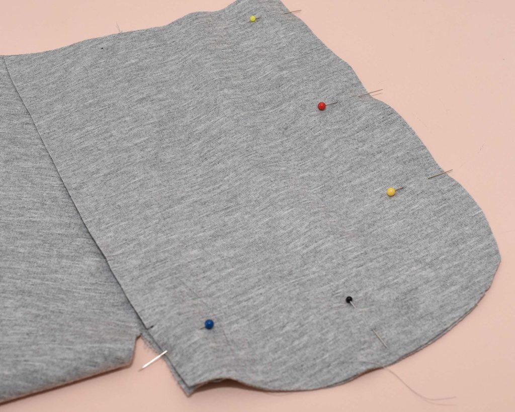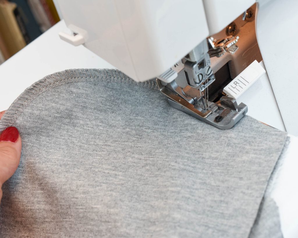 Stitch along the edges to close the pocket. Use a serger overlock seam or a narrow zigzag stitch. Make sure you don’t pull the pocket when sewing around the round corner as this can cause the seam to stretch out.