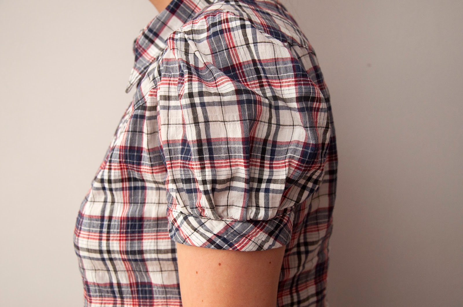 Okay, so over to the shirt that I made. It has lot of nice details, like a bias cut yoke, puff sleeves and snap-on buttons. The fabric is a cotton seersucker shirting that is pretty similar to the original Burda magazine style. In fact the only design change I did was omitting the piping that runs along the yoke, because sometimes I just don’t want the extra hassle.